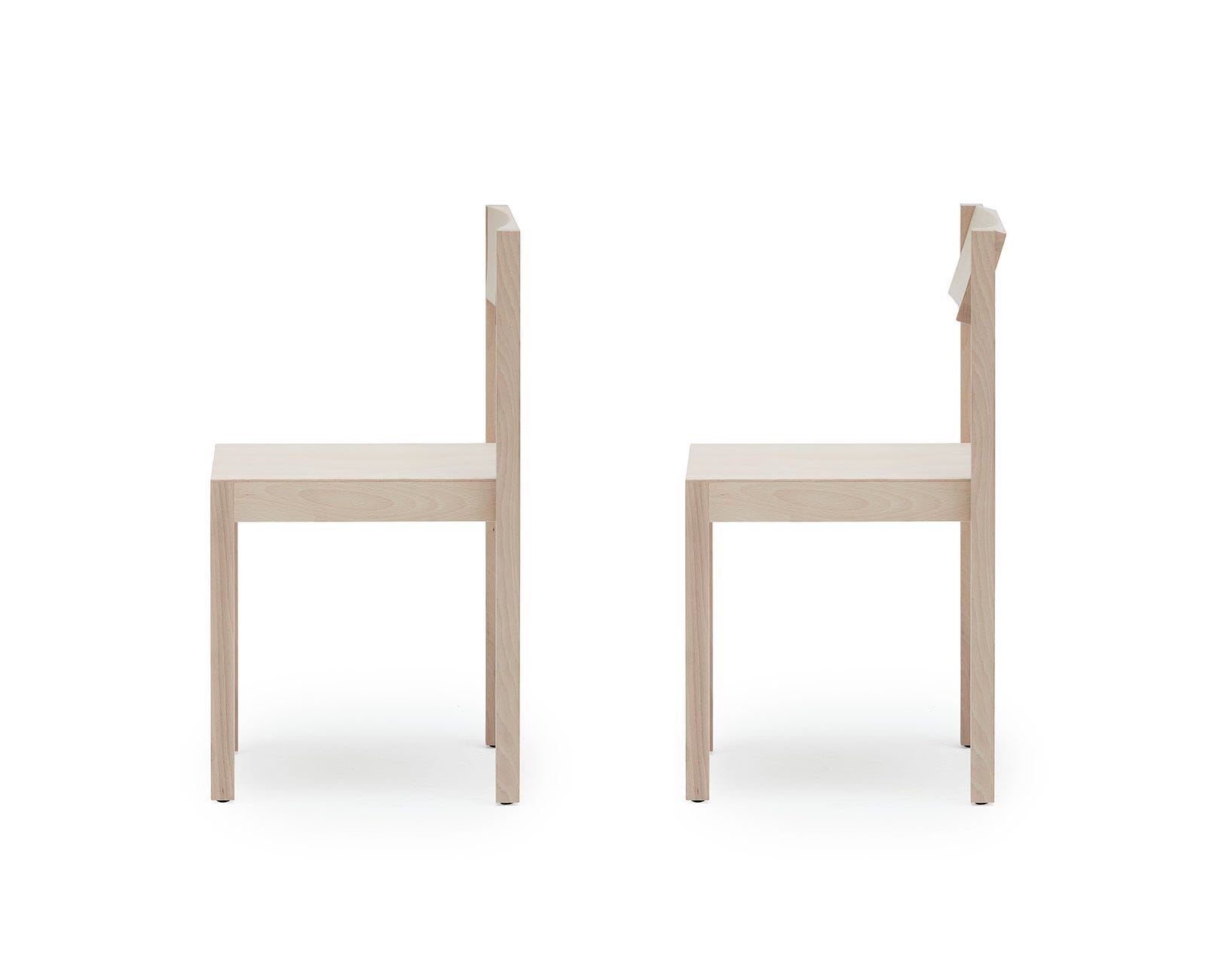A stackable wooden chair with reclining backrest. Clean with a quietly beautiful interaction.